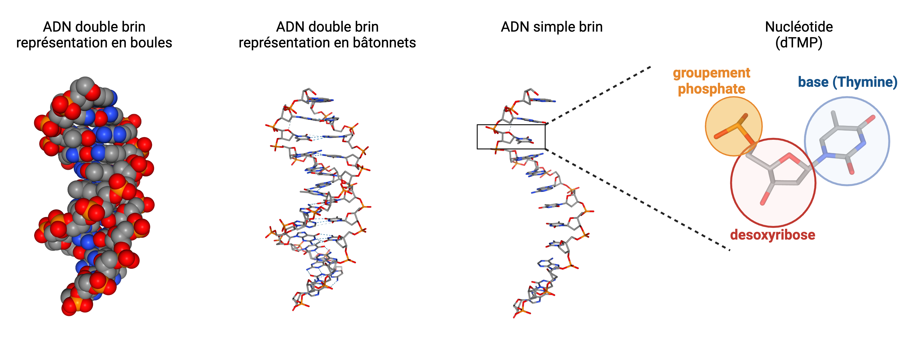 De gauche à droite : ADN double brin (représentation avec atomes boules), ADN double brin (représentation en batonnets), ADN simple brin (batonnets), désoxyribonucléotide (batonnets).