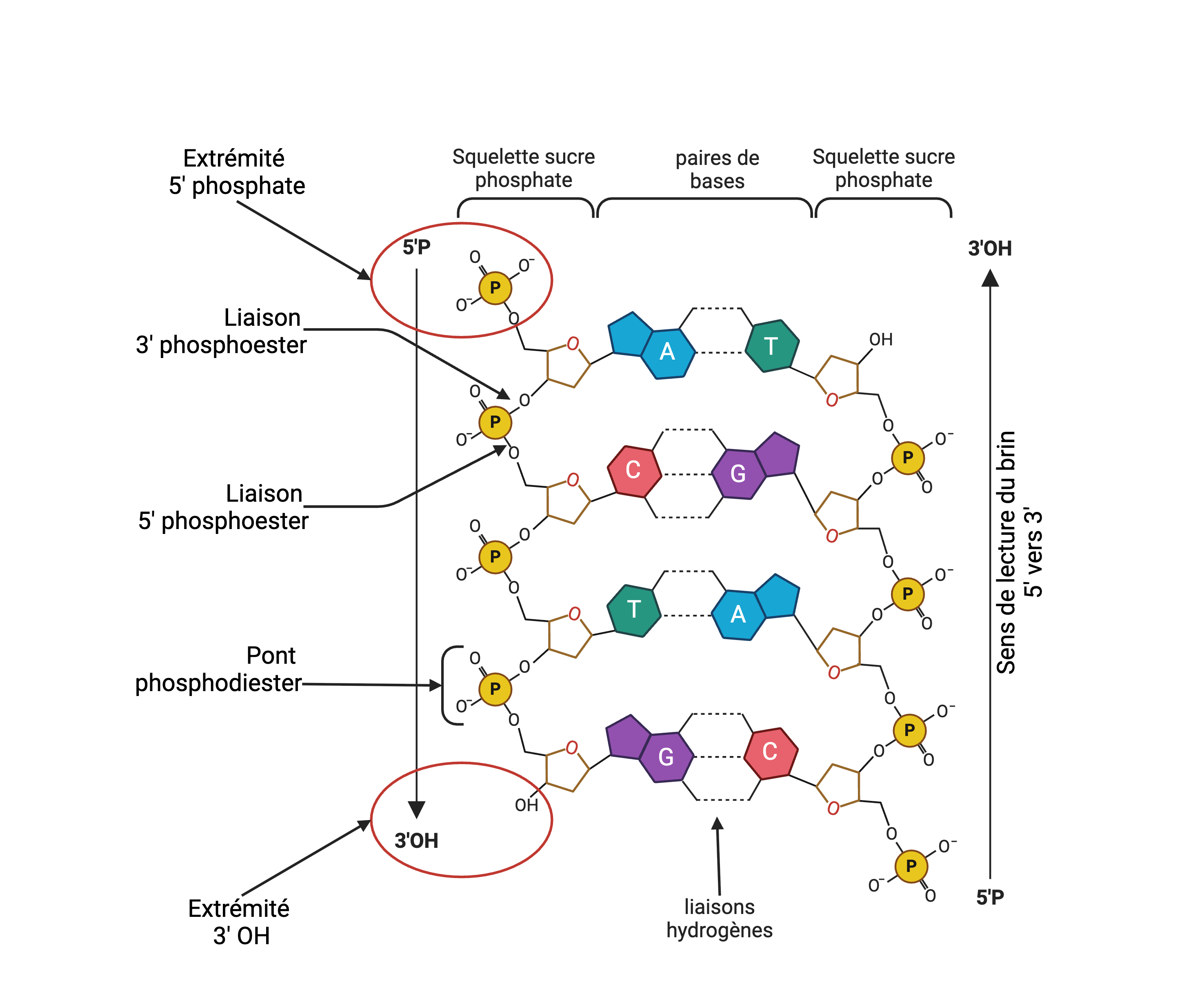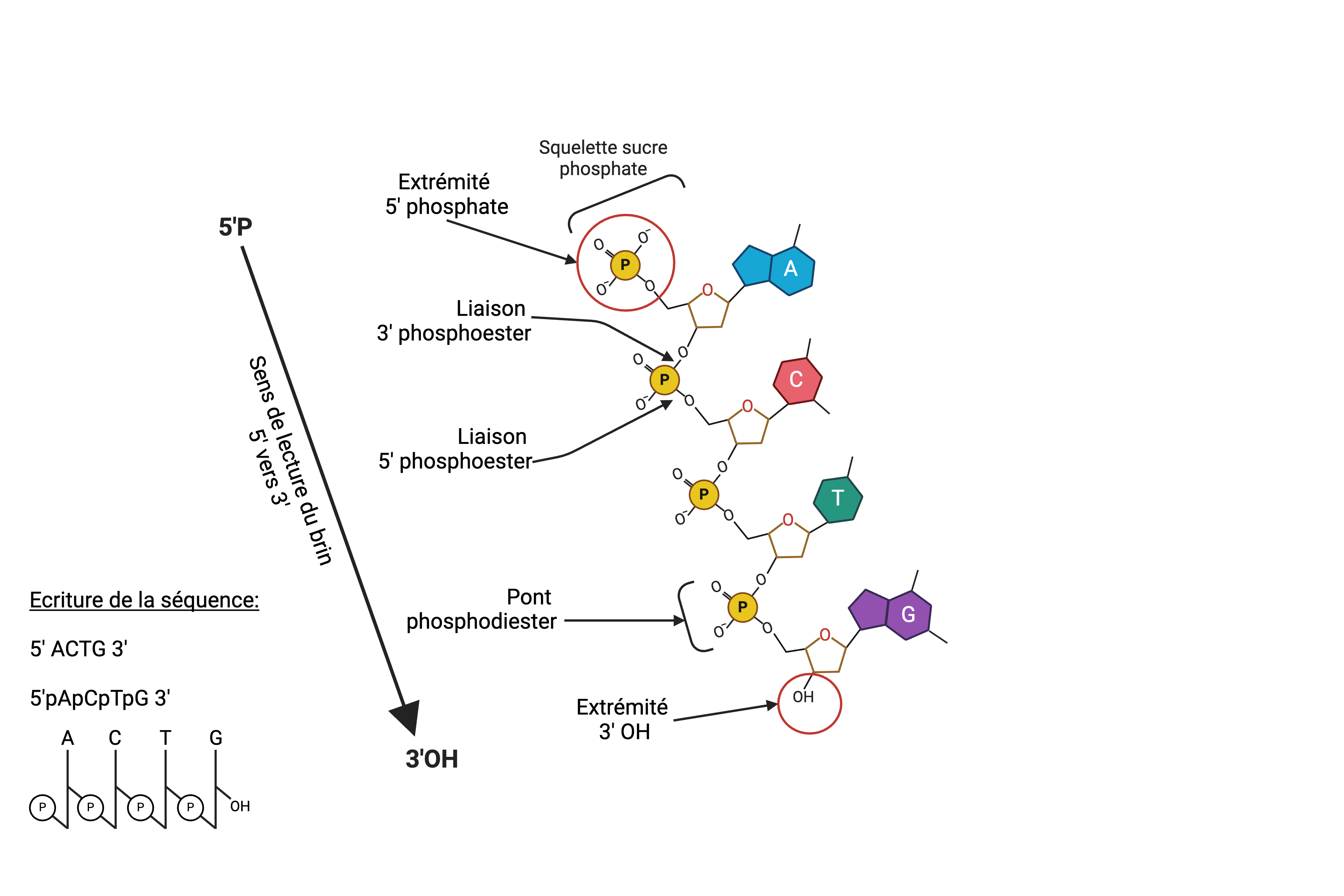 Par convention, la lecture et l'écriture d'une séquence nucléotidique se fait depuis l'extrémité 5'phosphate (5'P) vers l'extrémité 3' Hydrolxyle (3'OH) de l'oligonucléotide.