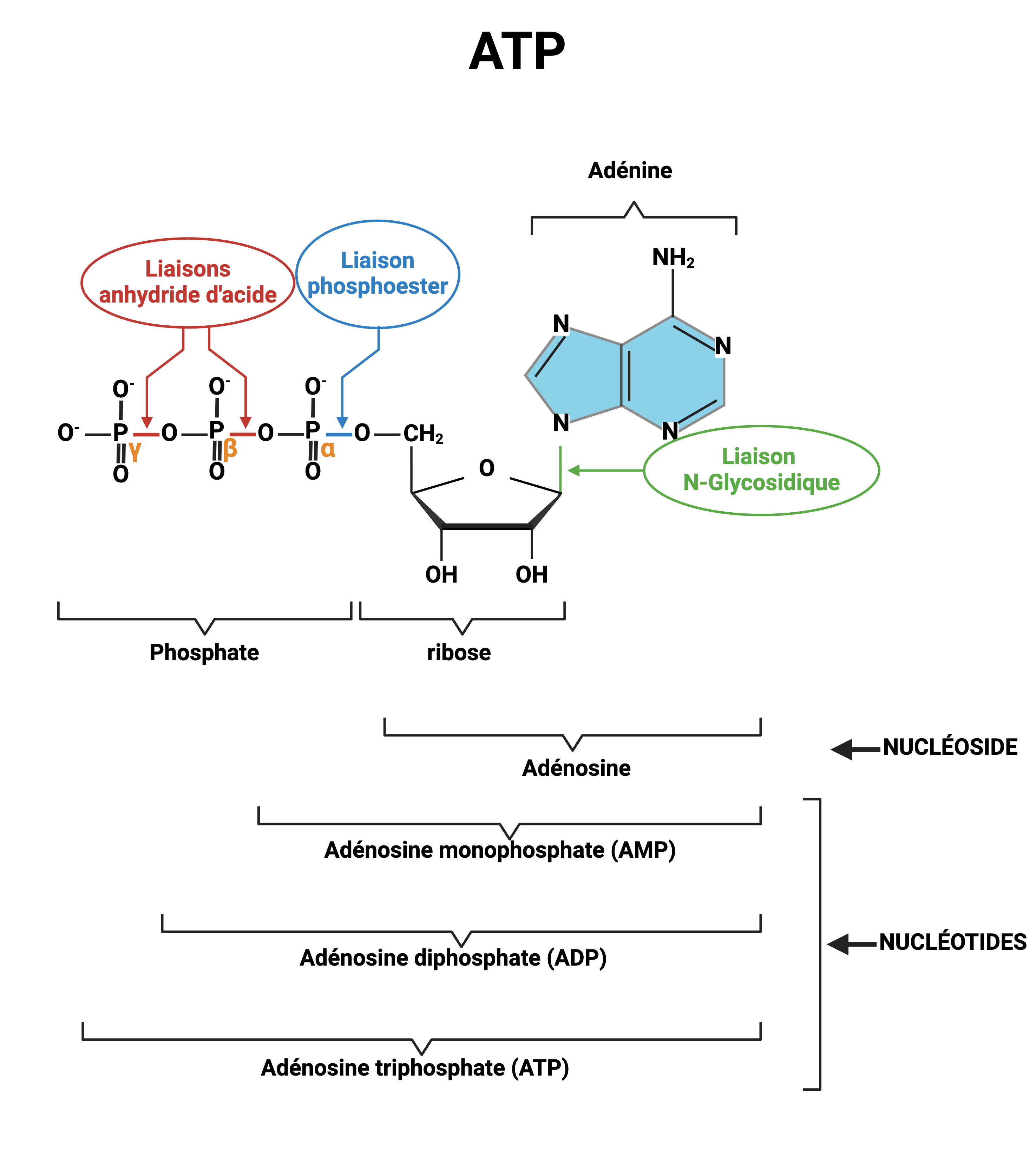 A titre d'exemple est présenté ci-dessous l'ATP un ribonucléotide qui n'est pas présent dans l'ADN mais qui répond au même règle de structure et de nomenclature qu'un désoxyribonucléotide (la différence est au niveau du sucre, désoxyribose dans l'ADN et ribonucléotide dans l'ARN).